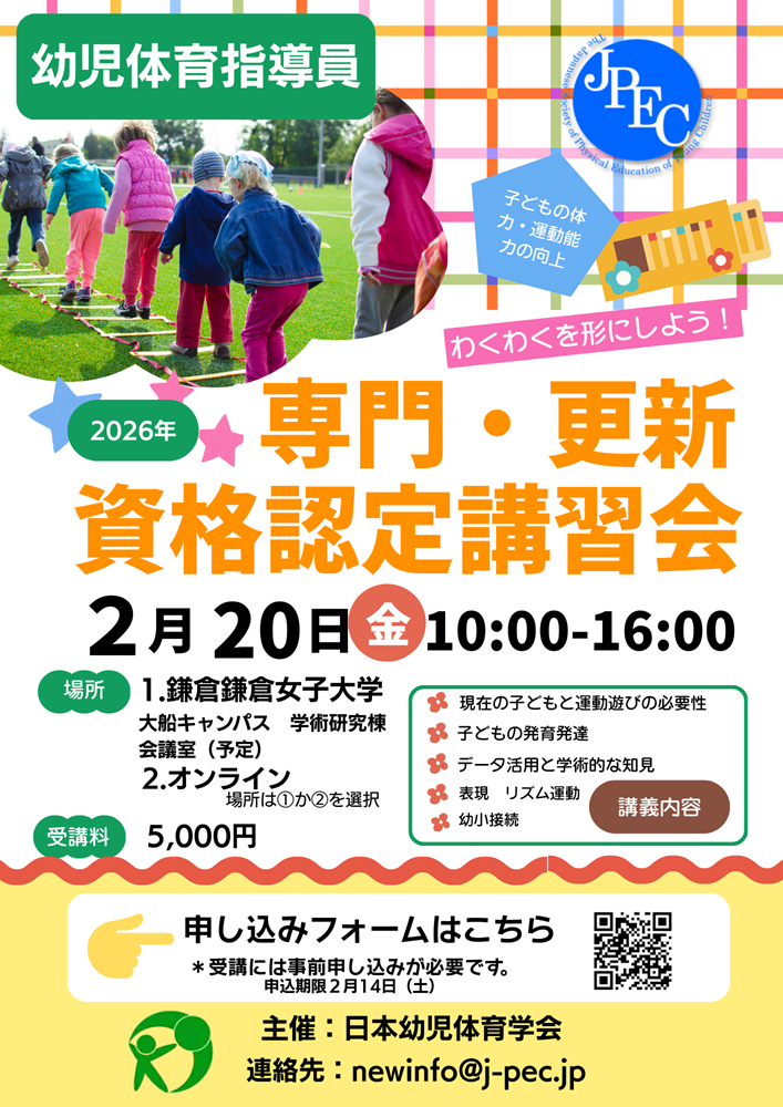 特に幼児期の健康を目指すためには、十分な運動遊びと基本的な生活リズムづくりが大切となります。皆様とともに、幼児体育に関する研鑽を積み、子どもたちの生涯の健康に研究・実践を通して寄り添える学会として発展できますよう、今後も努めてまいります。どうぞよろしくお願い致します。